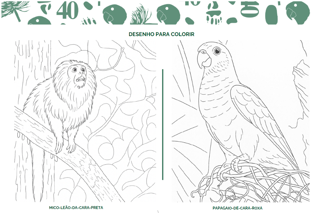 É hora de soltar o artista que há em você, pequeno guardião! Imagine-se sendo um artista e use sua criatividade para colorir as espécies. No seu mundo, que cor teriam as espécies Mico-leão-da-cara-preta e Papagaio-de-cara-roxa?